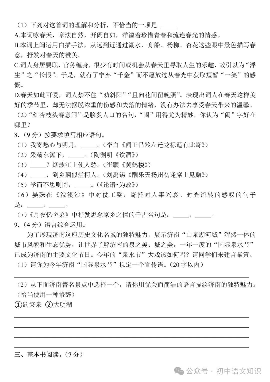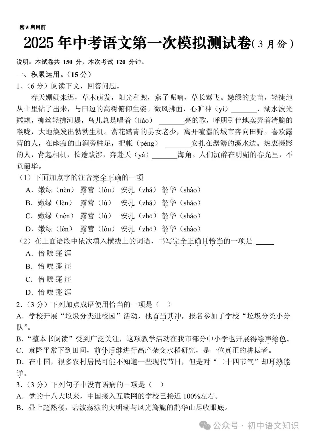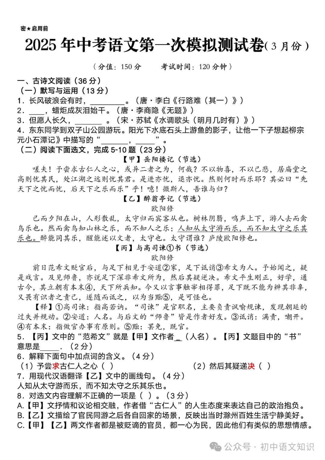 中考生们3月份即将迎来第一次中考模拟测试,今天王老师整理了一份2025年中考语文第一次模拟测试卷,帮助同学们查漏补缺,还没考的抓紧打印练习!