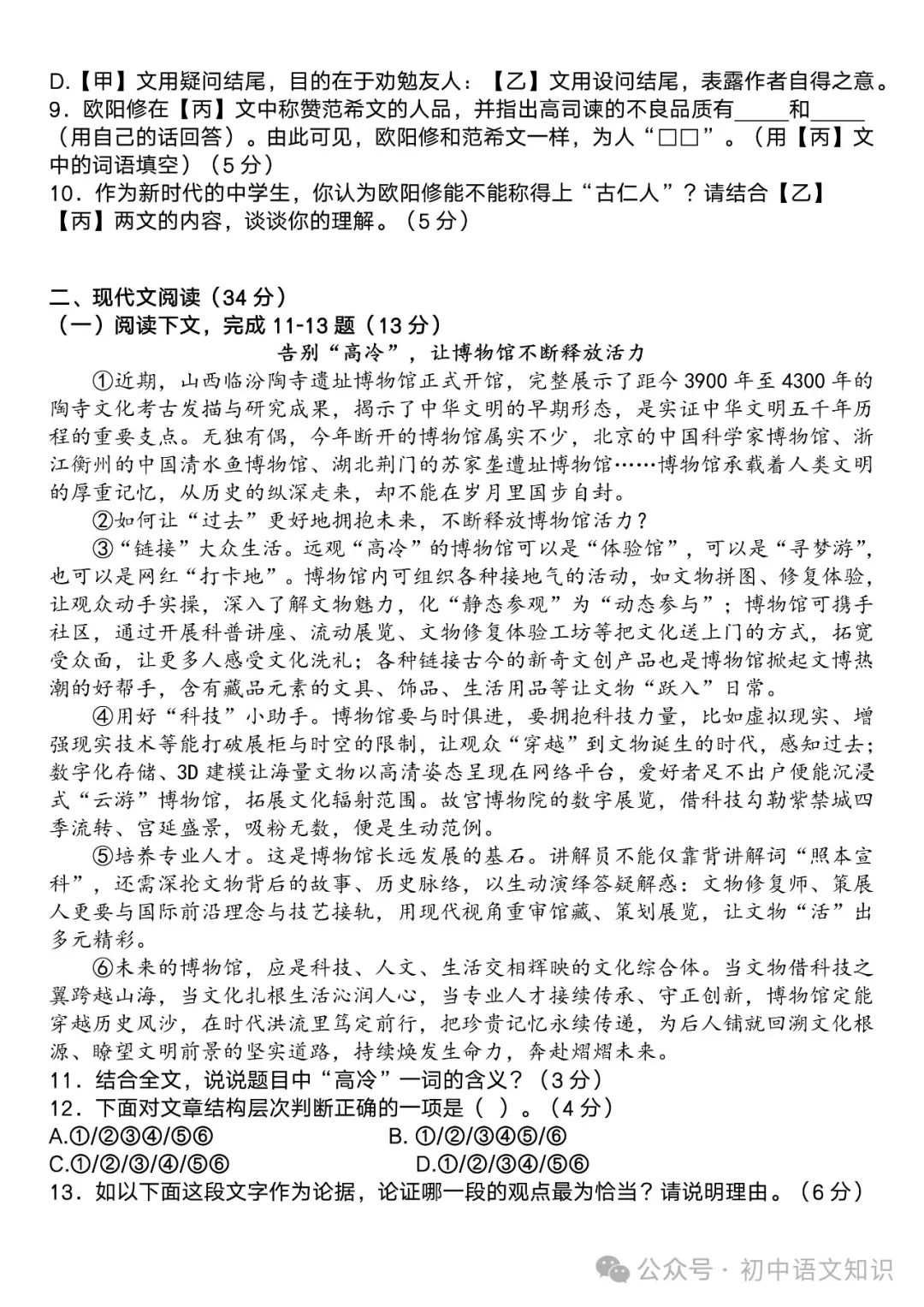 10.作为新时代的中学生,你认为欧阳修能不能称得上“古仁人”?请结合【乙】【丙】两文的内容,谈谈你的理解。(5分)