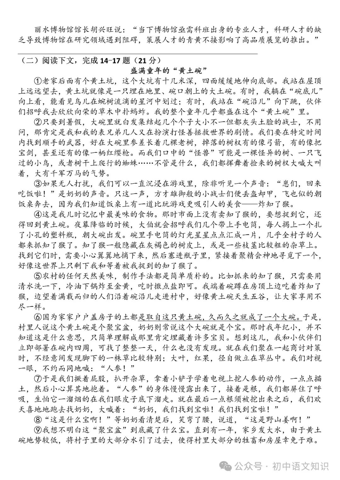 17.答案示例:作者略写了黄土碗的来历和他人对黄土坑的评价,重点叙写他亲身经历的与黄土碗相关的事件;几个事件的先后排序由浅入深地写出黄土坑是个"宝"的含义;以黄土坑为线索组织材料,作者的体验越来越丰富,情感越来越深厚,表达了对黄土坑及故乡风物的感恩与眷恋之情。